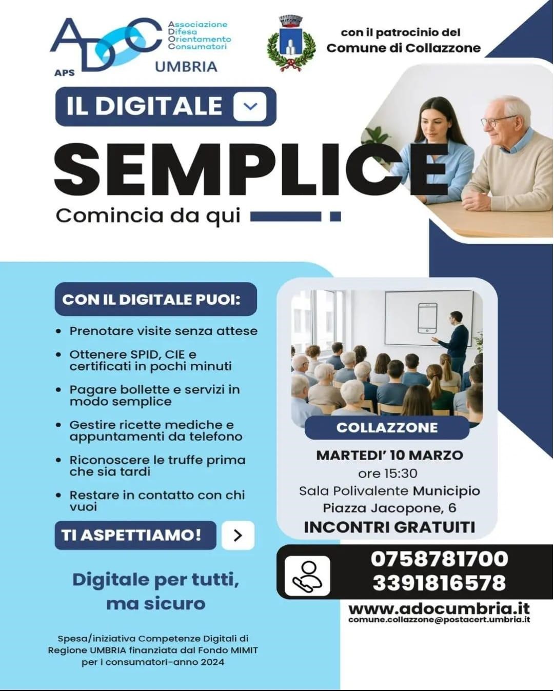 Martedì 10 marzo alle 15:30, presso la Sala Polivalente del Comune, ADOC Umbria, col patrocinio del Comune di Collazzone, promuove un incontro per rendere il digitale più semplice per tutti.