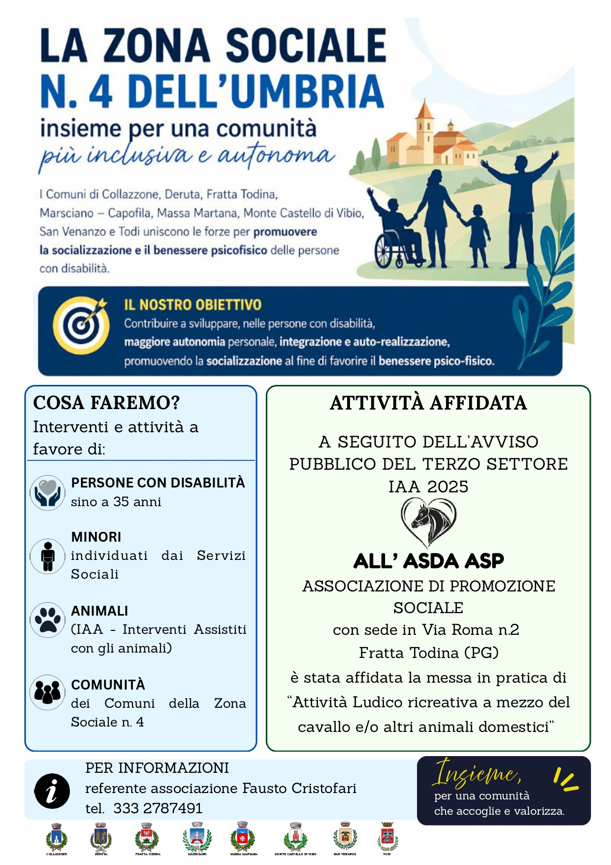 A seguito dell’Avviso Pubblico del Terzo Settore IAA 2025, le attività sono state affidate all’Associazione di Promozione Sociale ALL’ASDA ASP, con sede in Via Roma n. 2, Fratta Todina (PG).